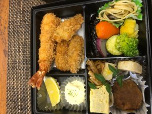 大海老フライ、カキフライと葉山牛入り自家製和風ソースハンバーグのミックス弁当です。季節の鎌倉温野菜、自家製厚焼き玉子、自家製煮物などフライには自家製タルタルソース添え。全て手づくり無添。